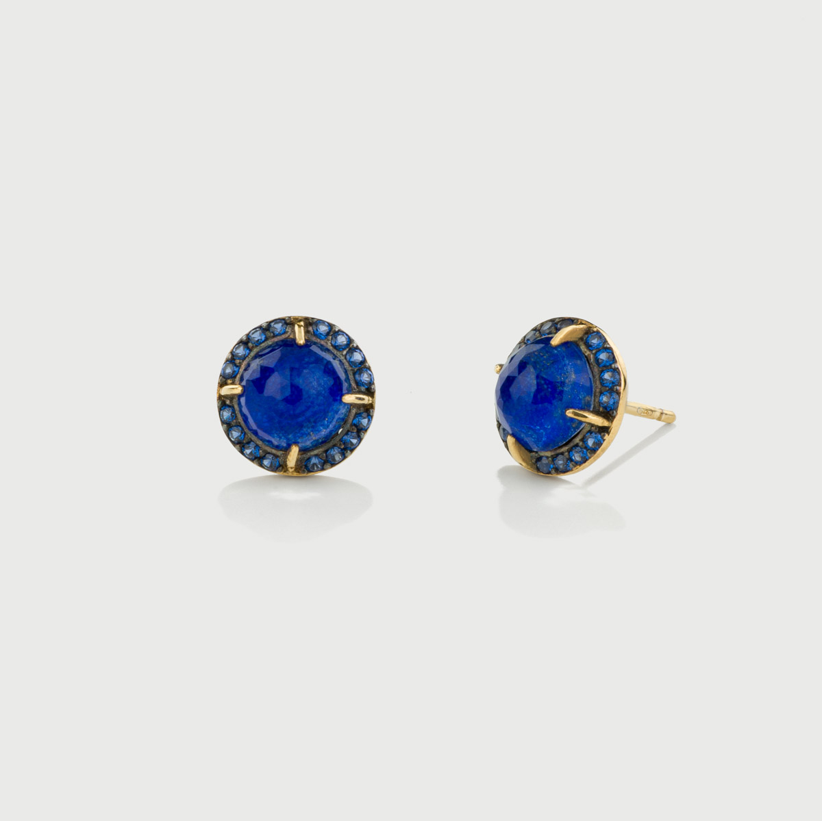 These bright halo earrings feature Doublet Crystal Quartz with Lapis Lazuli in dazzling royal color with gold inclusions.