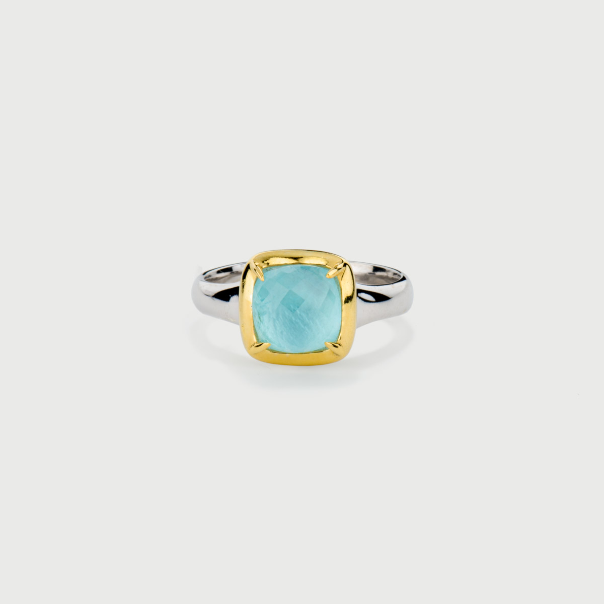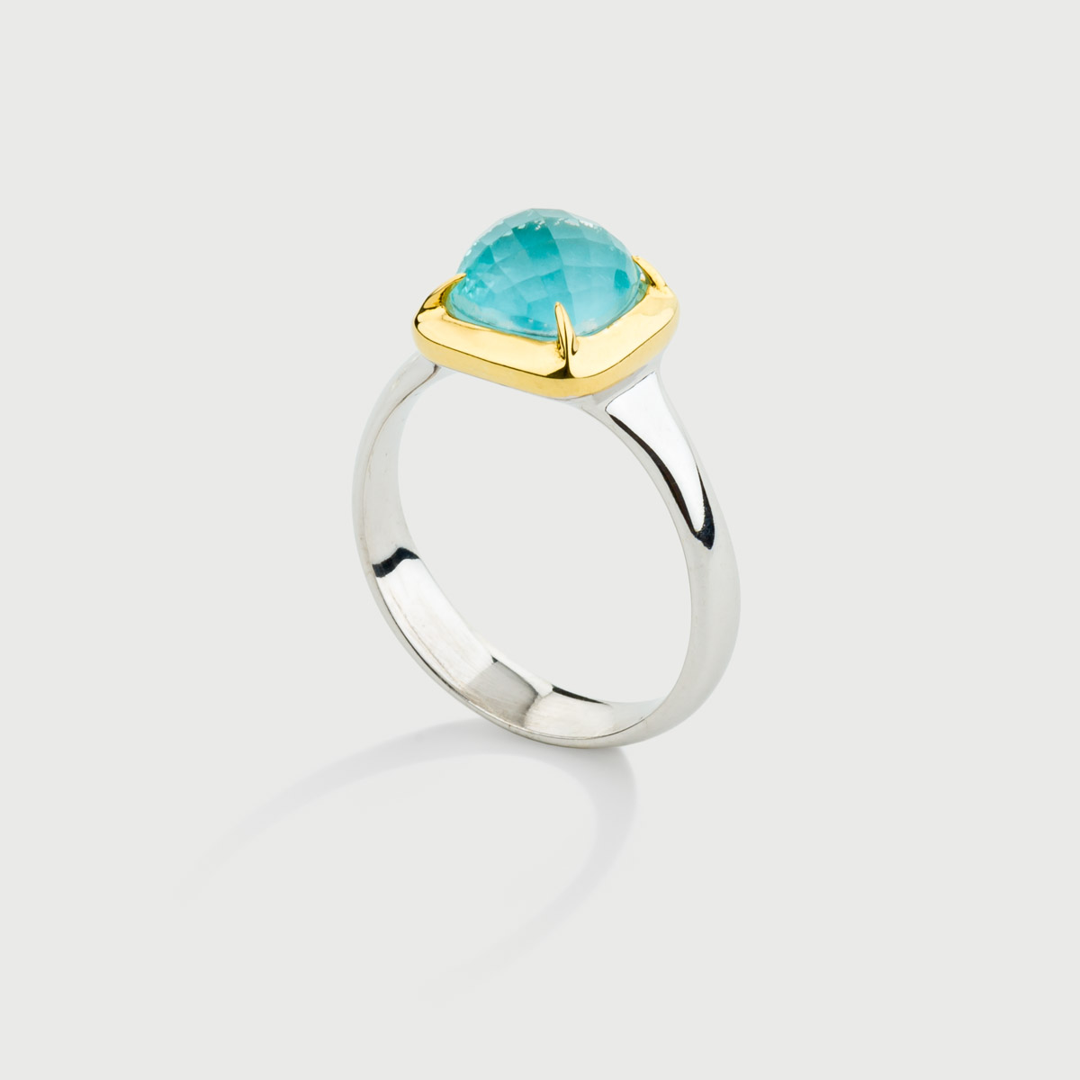 This bright sea color ring is made in silver 925 and hosts an alluring Doublet Crystal Quartz with Aquamarine.