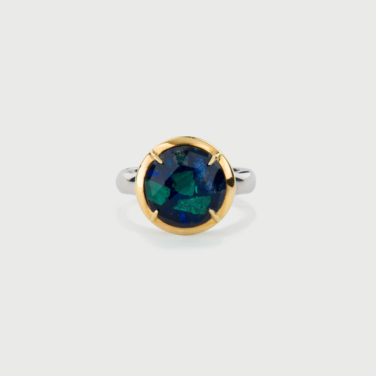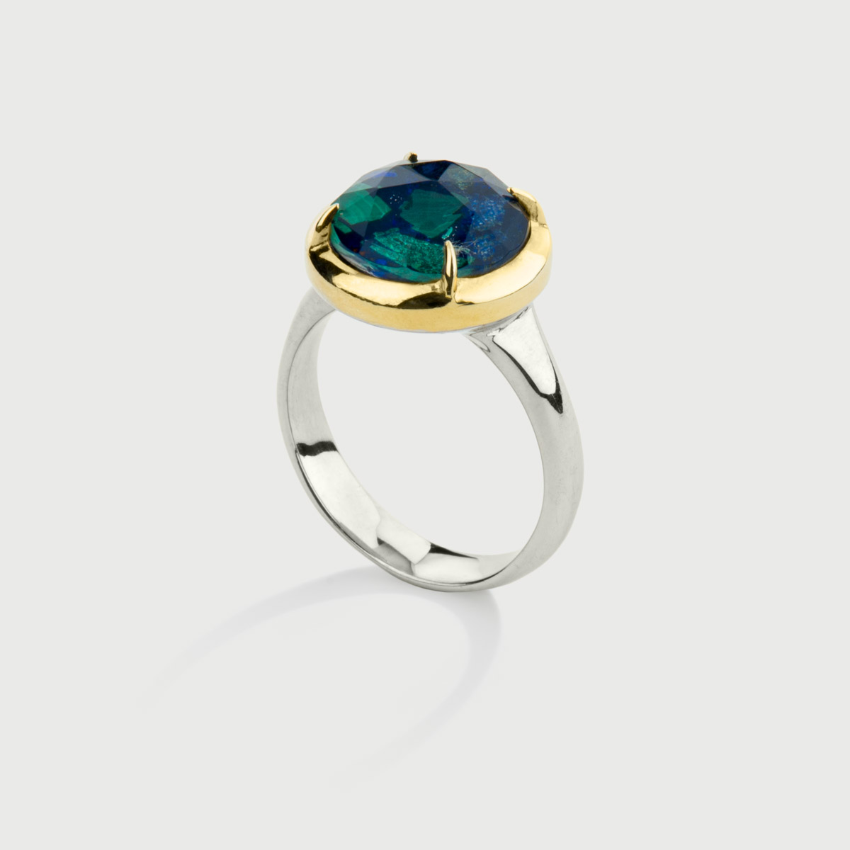 Doublet Crystal Quartz with Azurite Gold Plated Silver Ring