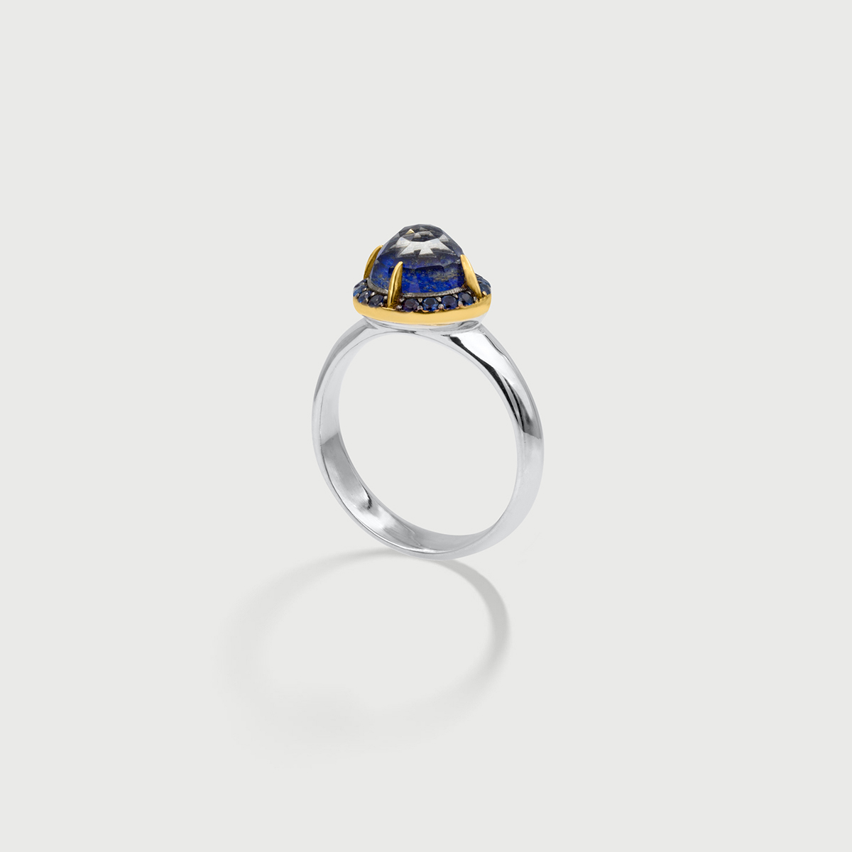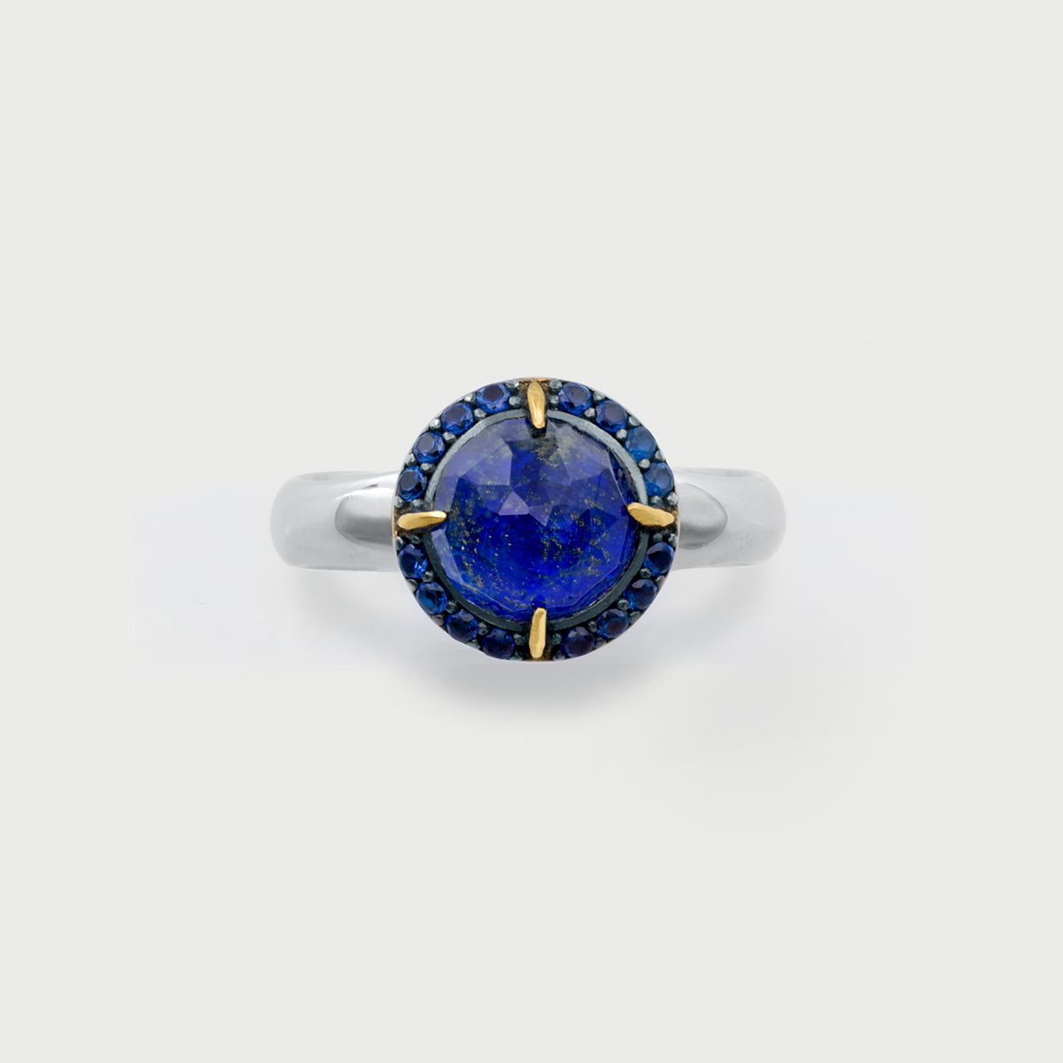 This bright halo ring, cast of 925 silver, features Doublet Crystal Quartz with lapis Lazuli in dazzling royal color with gold inclusions. The setting encircles the center gemstone in a collection of sixteen micro-pavé, brilliant cut zircon gemstones.